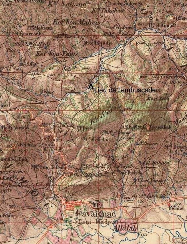 C'est sur une piste parallèle à l'oued El Améri, (coordonnées chasse : KY65 F 02-05) que les fells ont monté leur embuscade. Au niveau de l'oued, un Fusil Mitrailleur, prenait la piste en